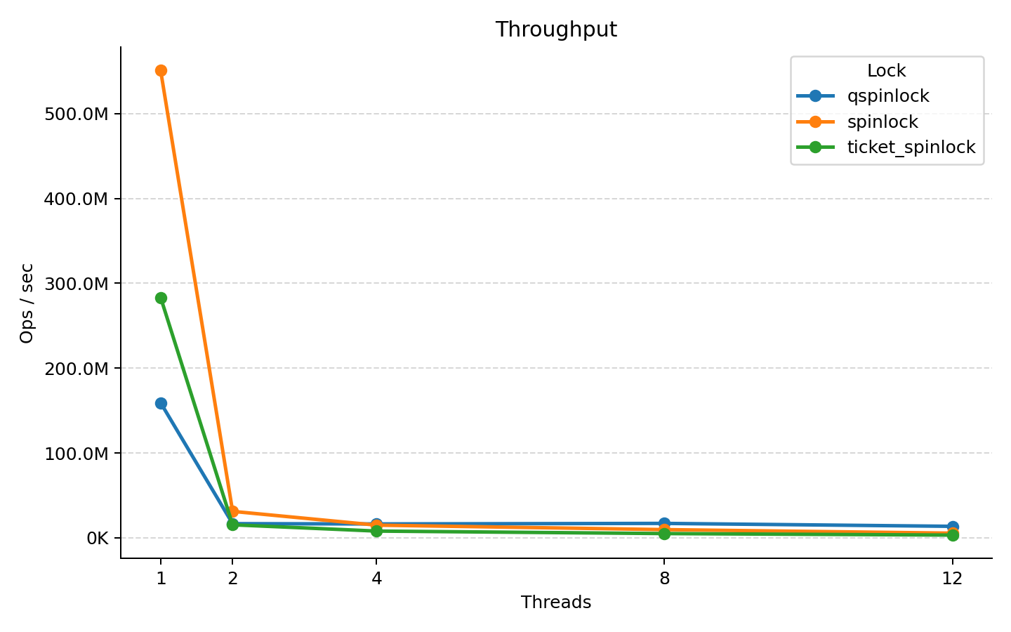 | Threads | Spinlock (ops/s) | Ticket Spinlock (ops/s) | qspinlock (ops/s) |